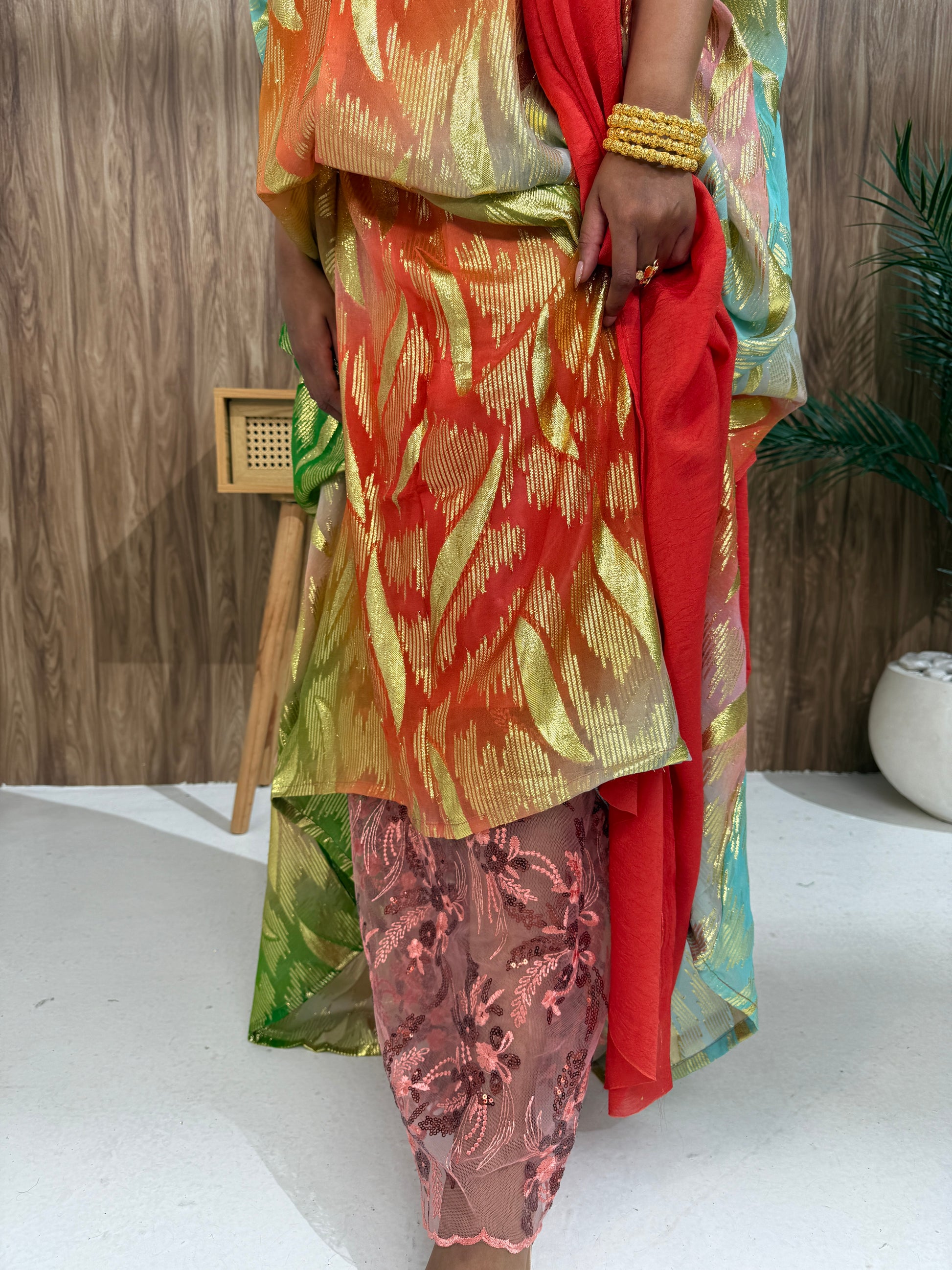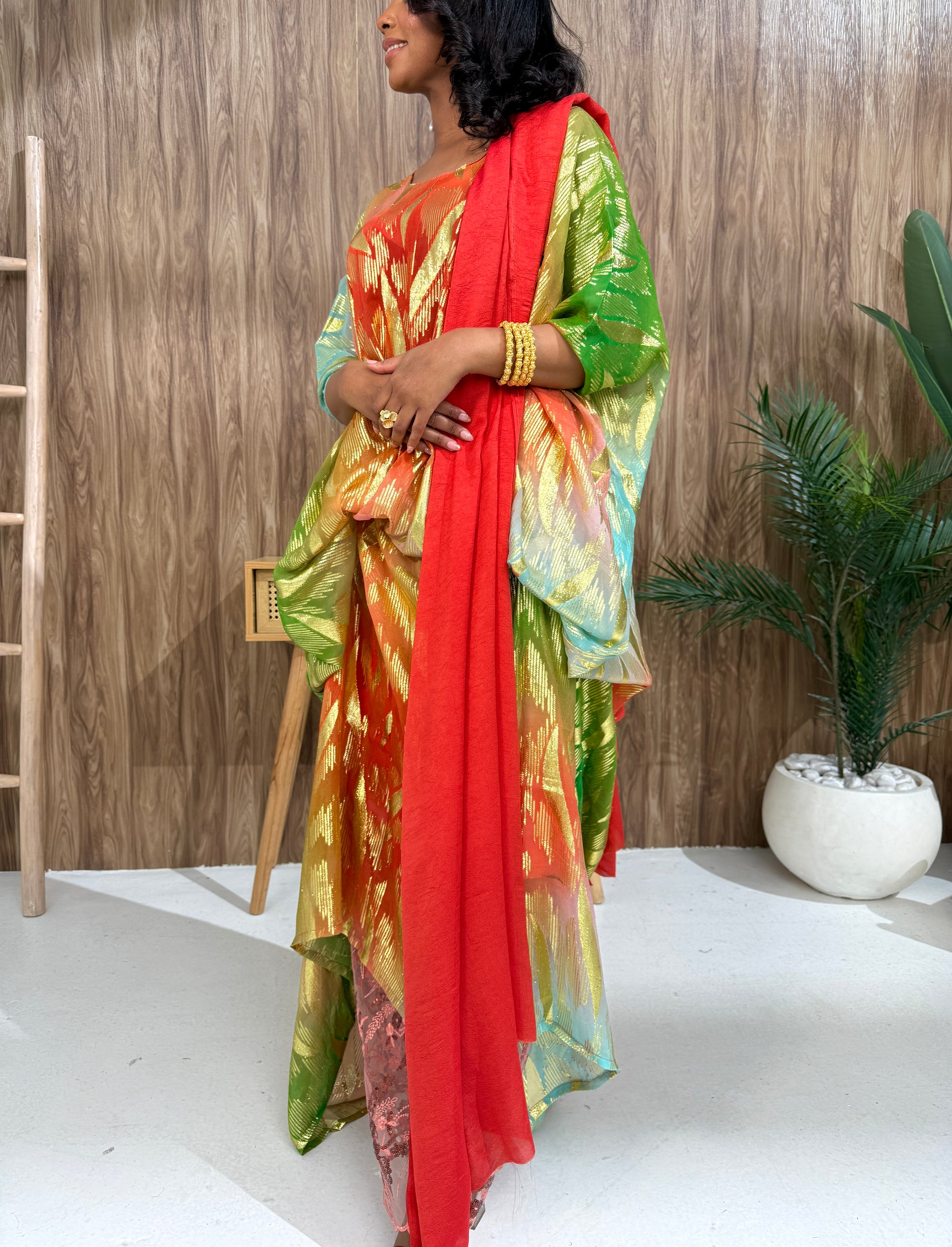 Our Layal Collection showcases striking, vibrant hues designed to brighten any occasion and elevate your wardrobe. Each dirac is thoughtfully crafted to be styled in multiple ways and comes complete with a matching chiffon shawl (shalmad) and a custom-made underskirt (gogarad) to enhance its intricate detailing.